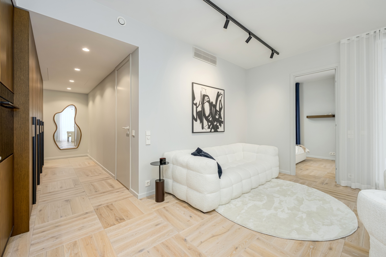 Koostöös sisearhitektiga on loodud korteri kujunduses ühtne tervik – iga detail alates valgustitest kuni garderoobisüsteemideni toetab kodu loomulikku voolavust ja mugavust.